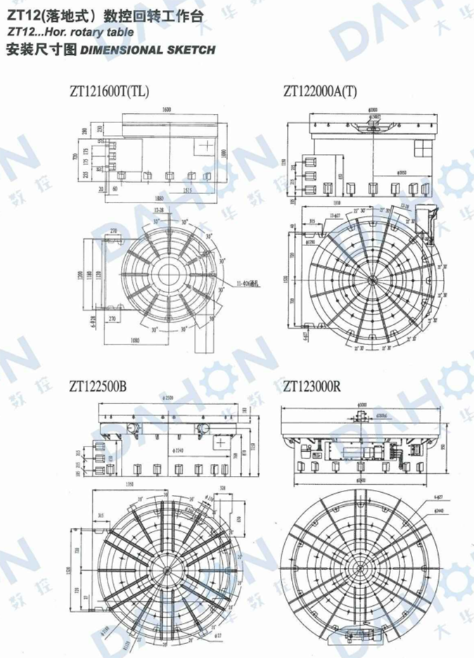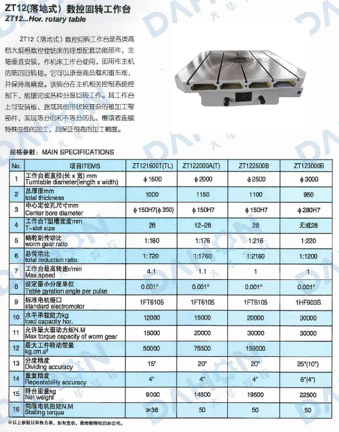 ZT12 (落地式) 數(shù)控回轉(zhuǎn)工作臺(tái)是各類(lèi)大規(guī)格數(shù)控鏜銑床的理想配套功能部件,主軸垂直安裝,作機(jī)床工作臺(tái)使用,即用作主機(jī)的第四回轉(zhuǎn)軸。它可以承受高負(fù)載和重車(chē)削,并保持高精度。該轉(zhuǎn)臺(tái)在主機(jī)相關(guān)控制系統(tǒng)控制下,能夠完成各種分度回轉(zhuǎn)工作。其工作臺(tái)上安裝板、盤(pán)或其他形狀較復(fù)雜的被加工零部件,實(shí)現(xiàn)等分白的和不等分的孔、槽或者連續(xù)特殊曲面的加工,且保證很高的加工精度。